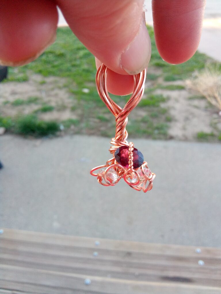 This piece was created while thinking of the friends who have helped me along the way over the years. A single strand of copper wire surrounds and embraces a gorgeous garnet and two white topazes. Wear it with pride, and think of those who have made your life that much better when you do.